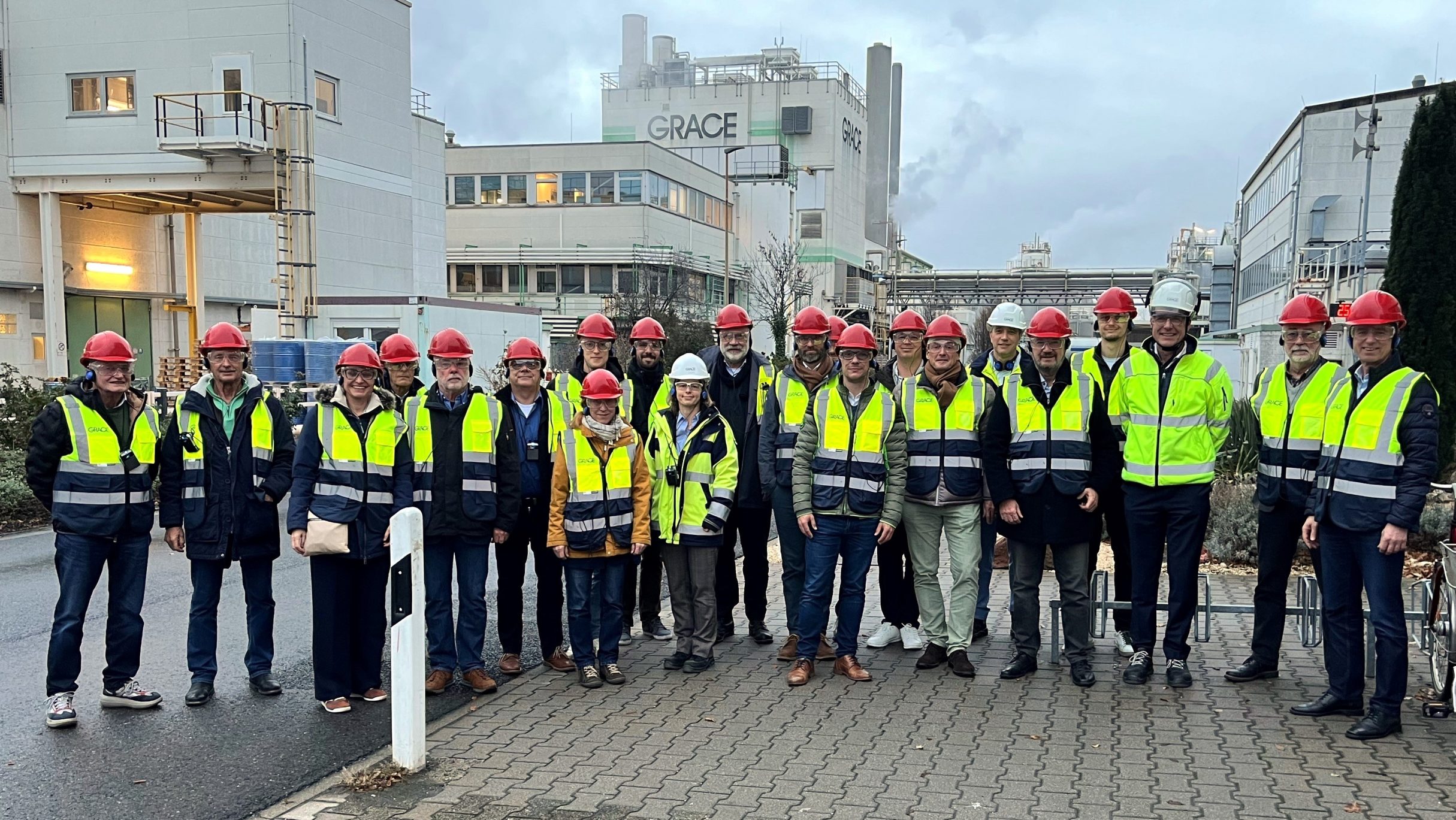 Am 25.11.2025 trafen sich die Mitglieder der Gruppe zu ihrer jährlichen Veranstaltung, Gastgeber war die Firma Grace in Worms, die die Teilnehmenden als erstes durchs Werk führte. Viele Schritte, reichlich Fragen und einige Erkenntnisse später (hier werden z.B. Partikel hergestellt, die Lack auf Weihnachtsbaumkugeln so gleichmäßig matt schimmern lassen) sammelten sich alle im Tagungsraum. Thomas Kolb, der die Leitung der Bezirksgruppe Oberrhein 2014 übernommen hatte, hat nach 11 Jahren sein Amt abgegeben. Sein Nachfolger als Leiter des Engler-Bunte-Instituts, Frederik Scheiff, stellte sich zur Wahl, die Gruppe Oberrhein zu übernehmen und wurde einstimmig gewählt und mit viel Applaus im neuen Amt begrüßt.